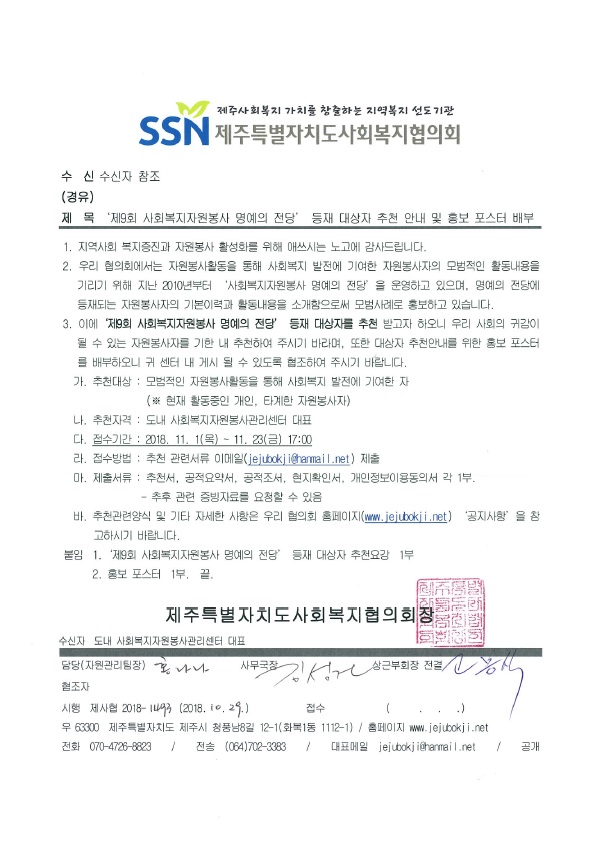 제9회 사회복지자원봉사 명예의 전당 등재 대상자 추천 안내