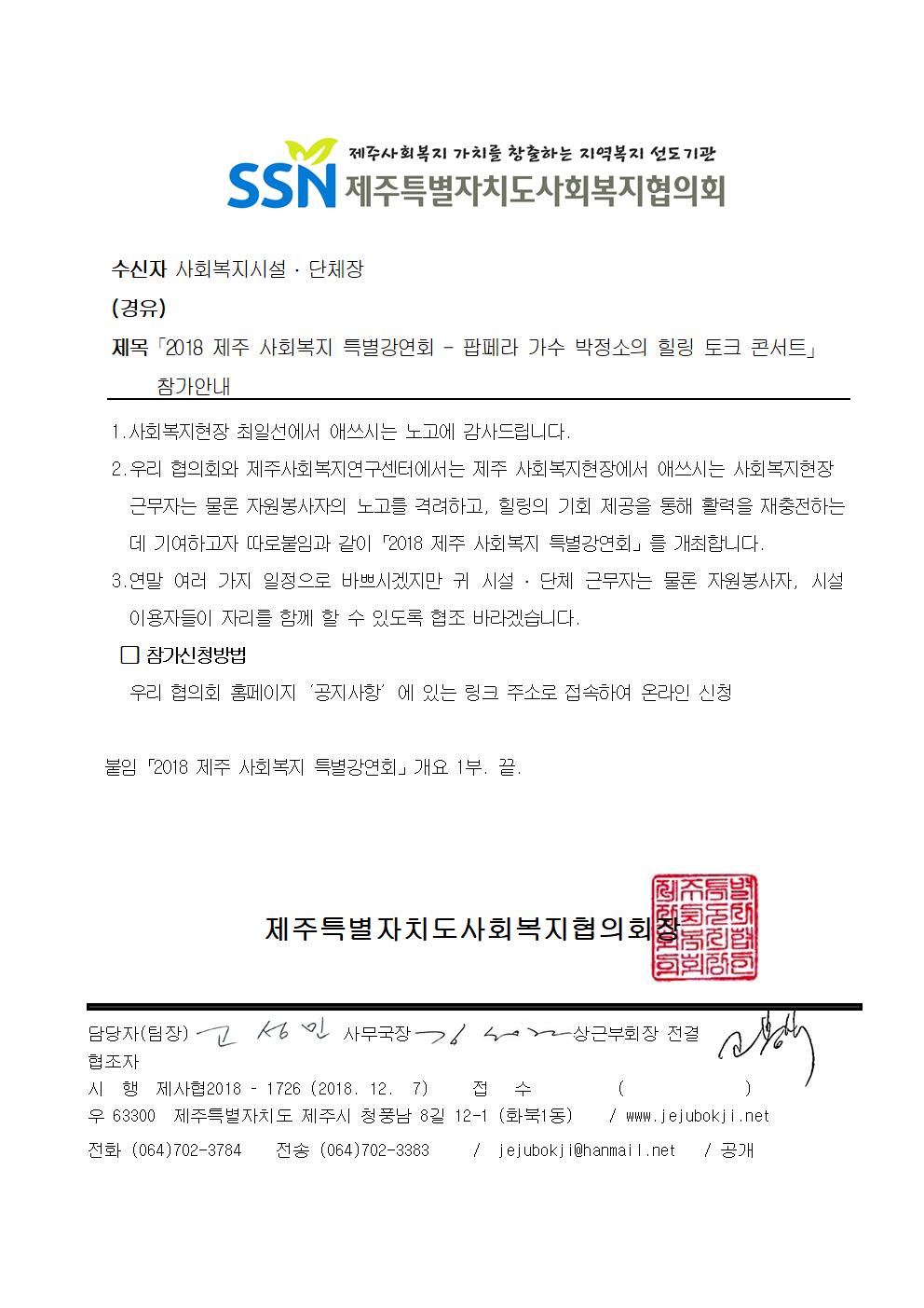 「2018 제주 사회복지 특별강연회 - 팝페라 가수 박정소의 힐링 토크 콘서트」참가안내