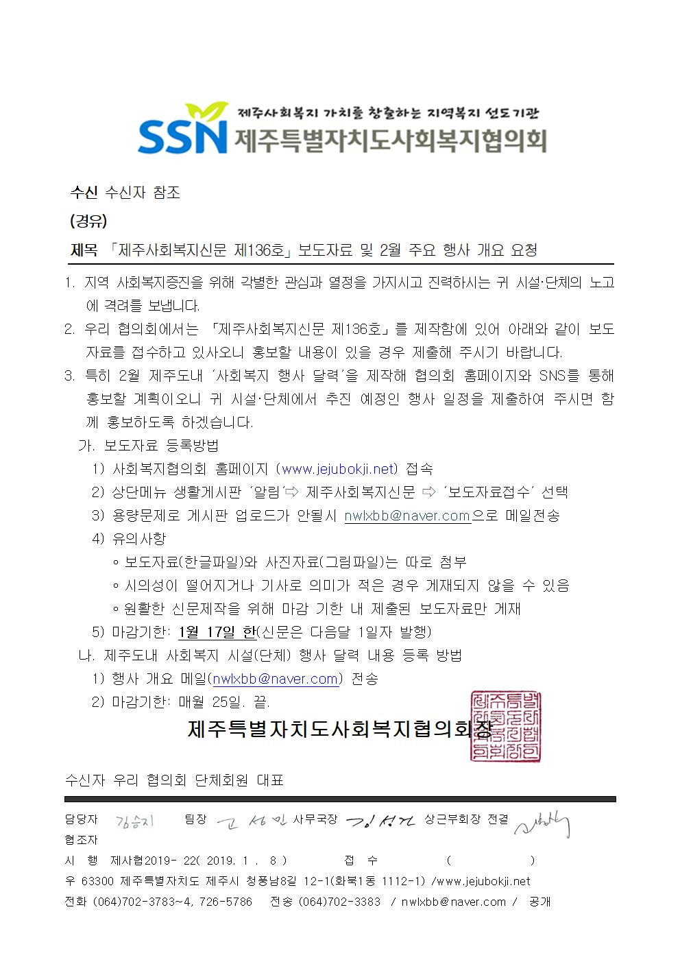 제주사회복지신문 제136호 보도자료 및 2월 주요 행사 개요 요청