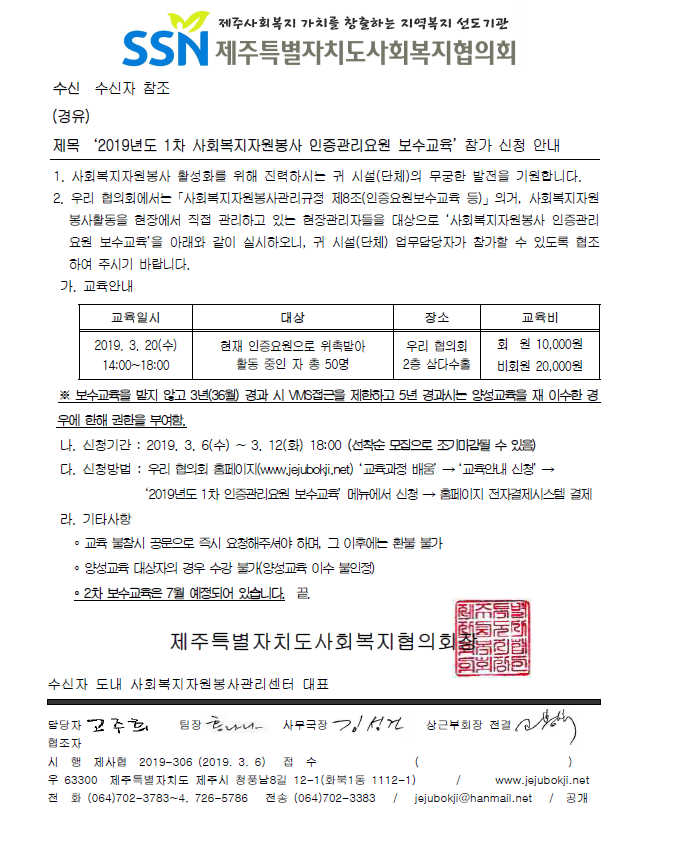 2019년도 1차 '사회복지자원봉사 인증관리요원 보수교육' 신청 안내