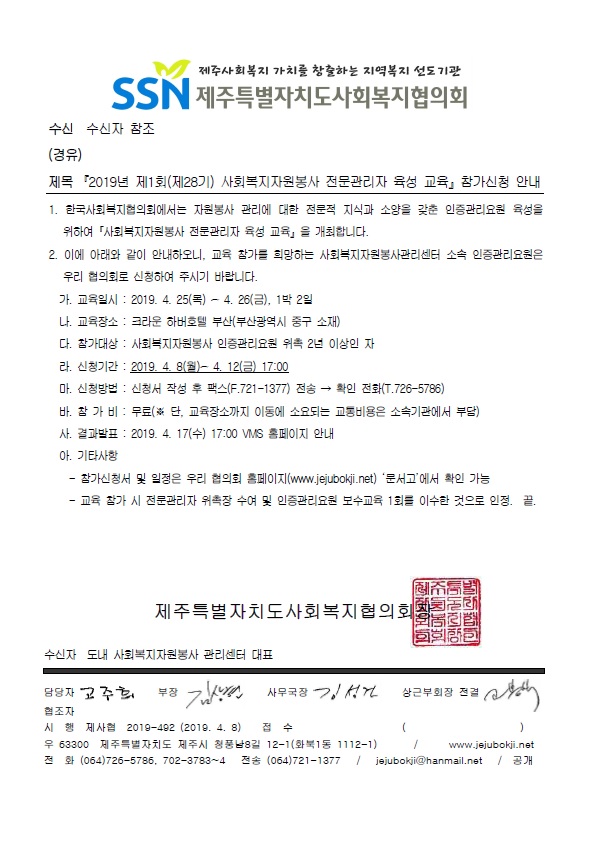 2019년 제1회(제28기) 사회복지자원봉사 전문관리자 육성교육 참가신청 안내