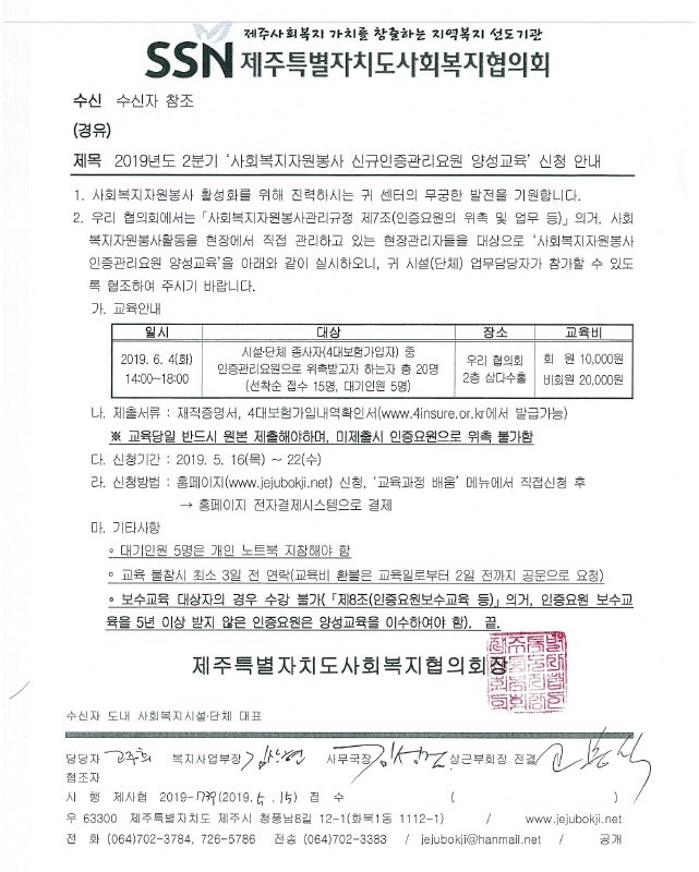 2019년도 2분기 사회복지자원봉사 신규인증요원 양성교육 신청 안내