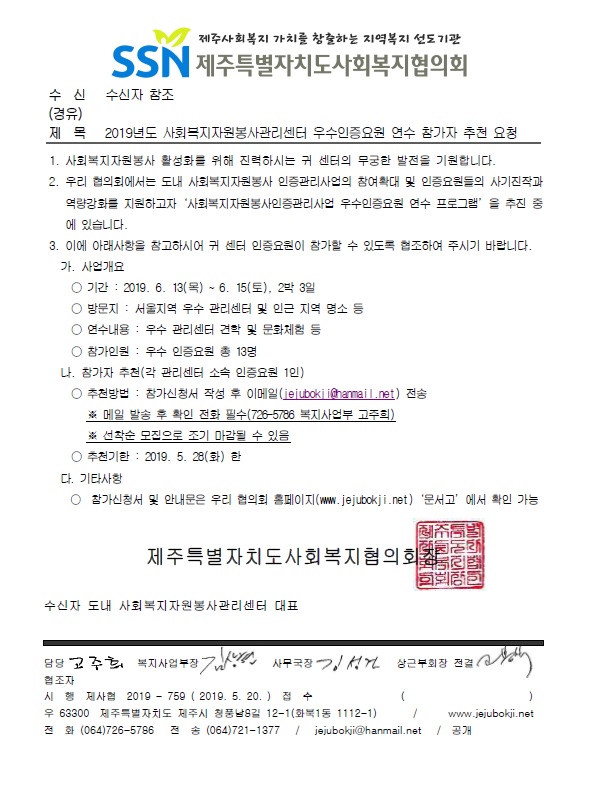 2019년도 사회복지자원봉사관리센터 우수인증요원 연수 참가자 추천 요청