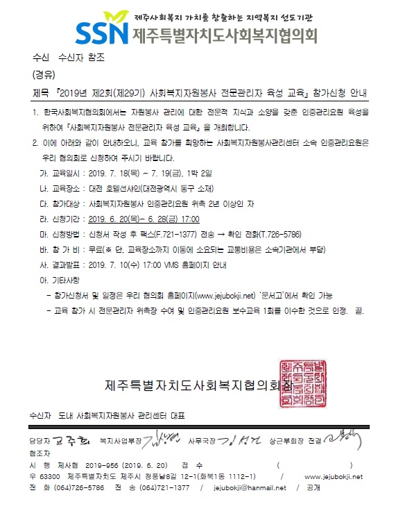 2019년 제2회(제29기) 사회복지자원봉사 전문관리자 육성교육 참가신청 안내