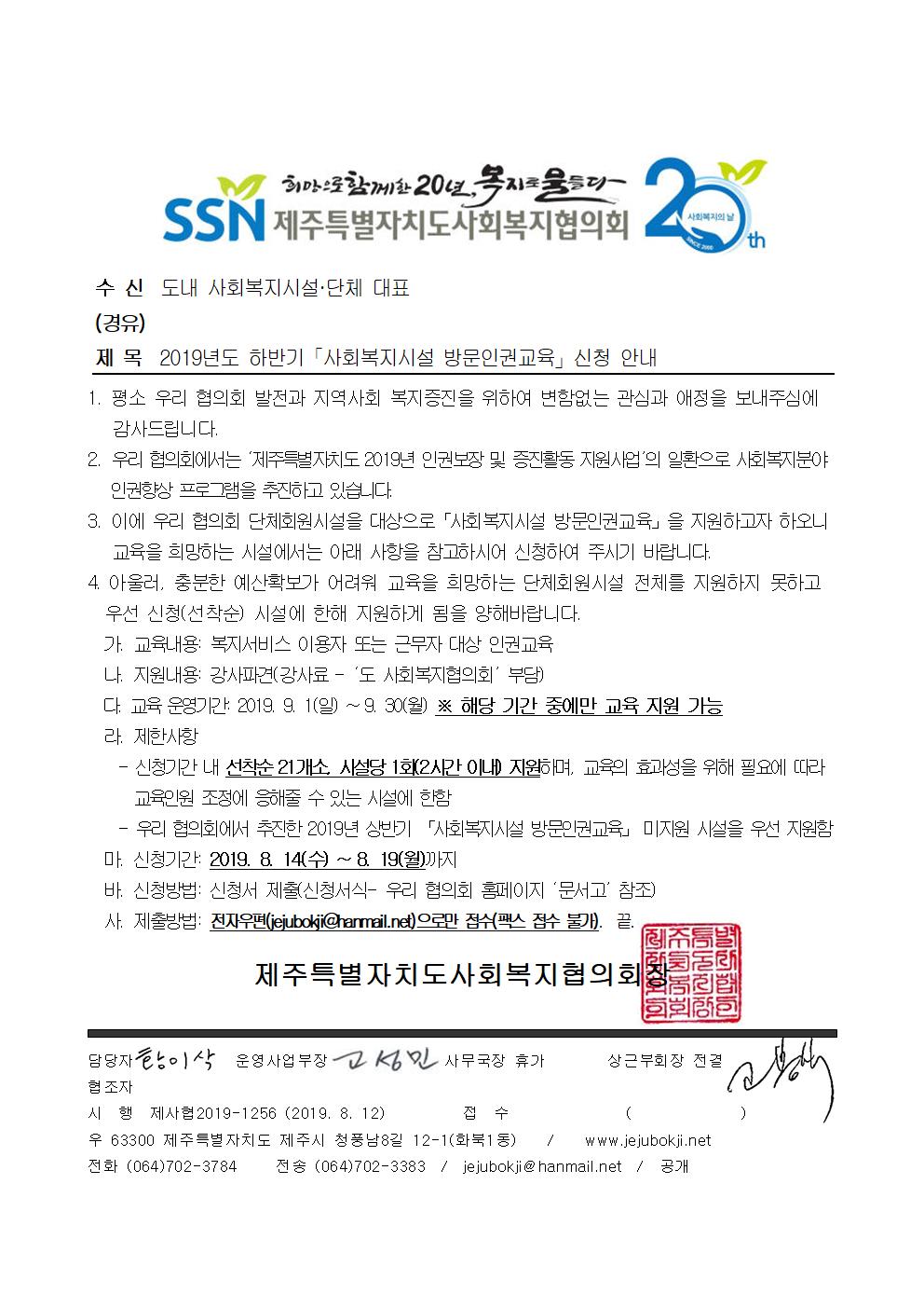 2019년도 하반기「사회복지시설 방문인권교육」신청 안내
