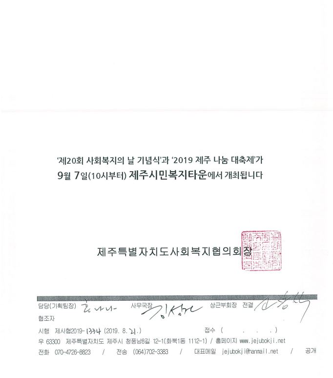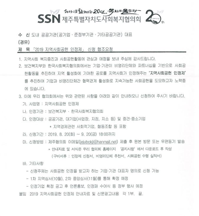 「2019 지역사회공헌 인정제」 신청 협조요청