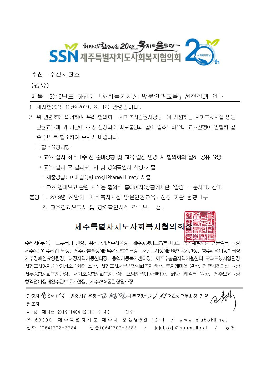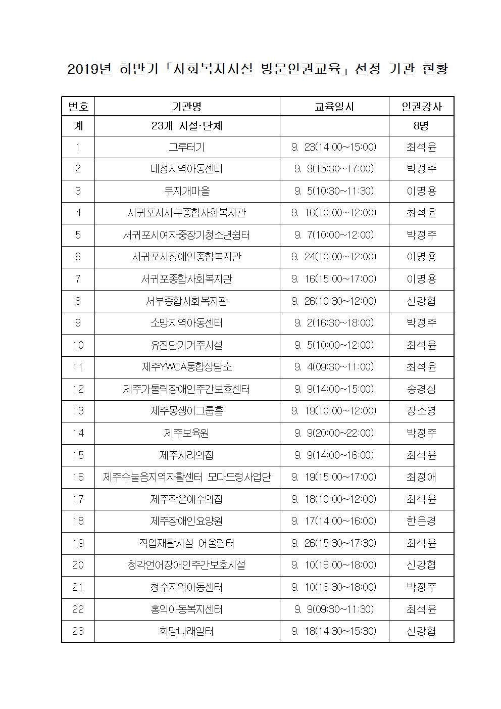2019년도 하반기「사회복지시설 방문인권교육」선정결과 안내