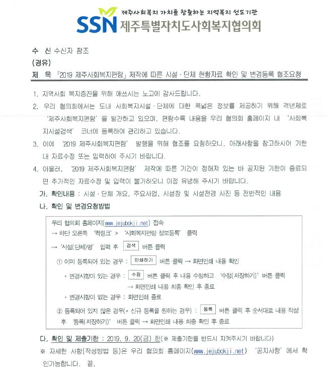 2019제주사회복지편람 현황자료 확인 및 변경등록 요청