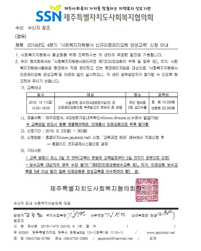 2019년도 4분기 '사회복지자원봉사 신규인증관리요원 양성교육' 신청 안내
