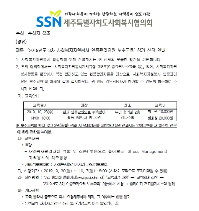 2019년도 3차 사회복지자원봉사 인증관리요원 보수교육 참가 신청 안내