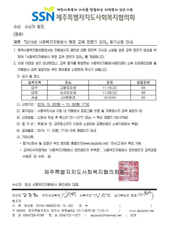 2019년 사회복지자원봉사 현장 교육 전문가 강의 참가신청 안내