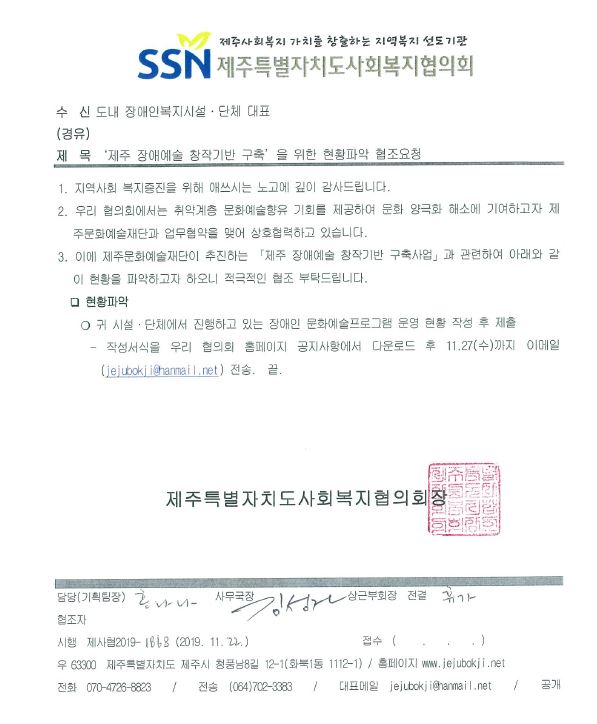 '제주 장애예술 창작기반 구축' 을 위한 현황파악 협조요청