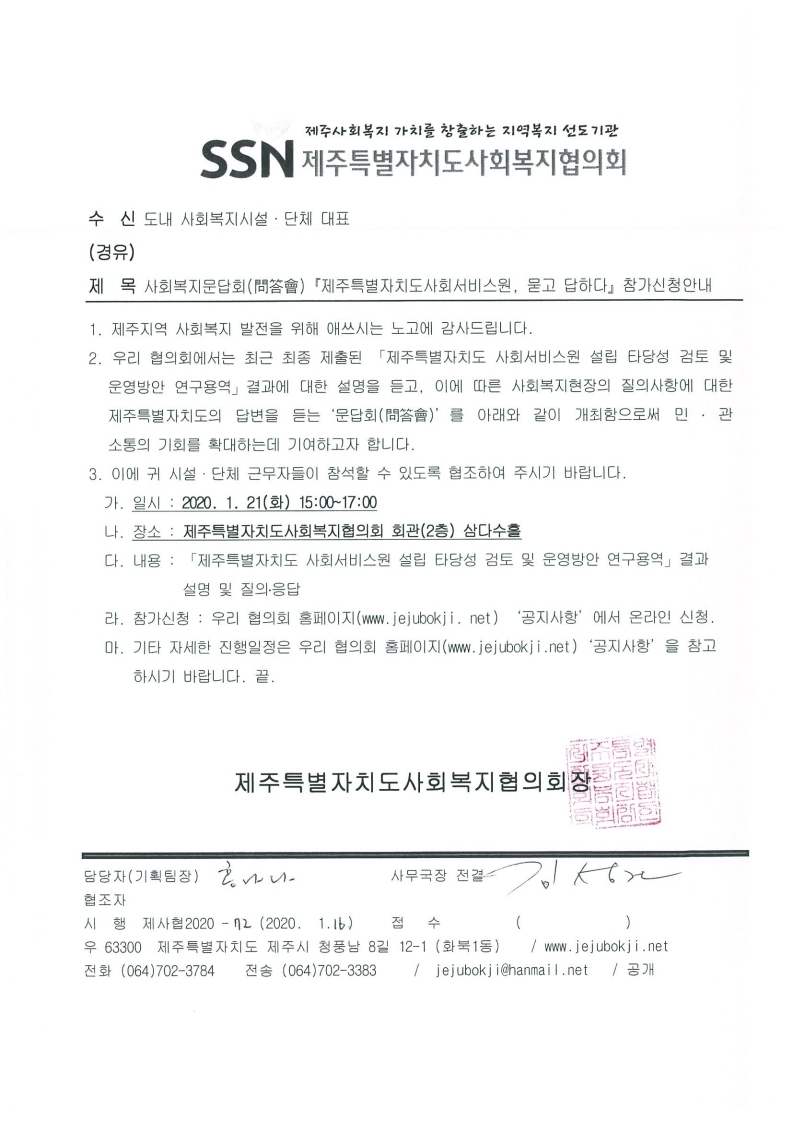 사회복지문답회(問答會) 「제주특별자치도사회서비스원, 묻고 답하다」참가신청안내