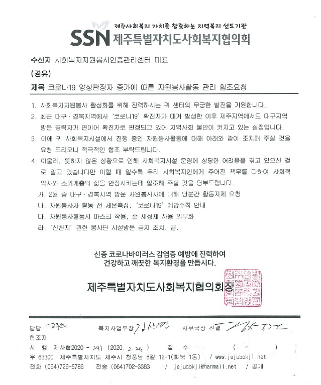 코로나19 양성판정자 증가에 따른 자원봉사활동 관리 협조요청
