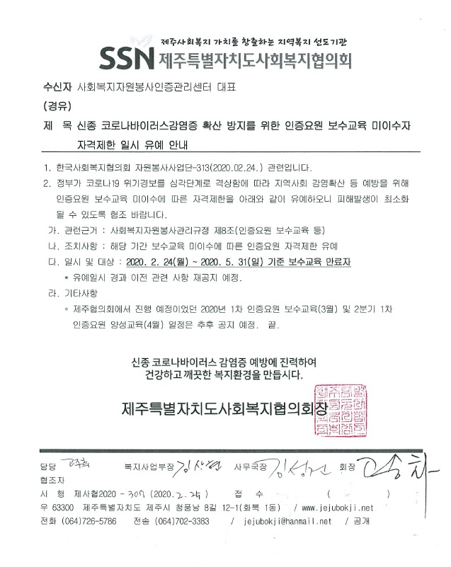 신종 코로나바이러스감염증 확산 방지를 위한 인증요원 보수교육 미이수자 자격제한 일시 유예 안내