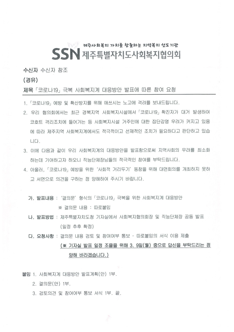 「코로나19」극복 사회복지계 대응방안 발표에 따른 참여 요청