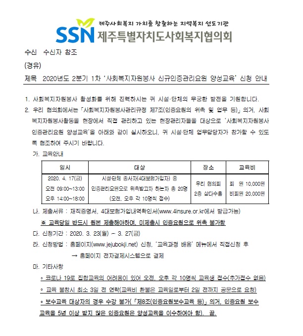 2020년도 2분기 1차 '사회복지자원봉사 신규인증관리요원 양성교육' 신청 안내