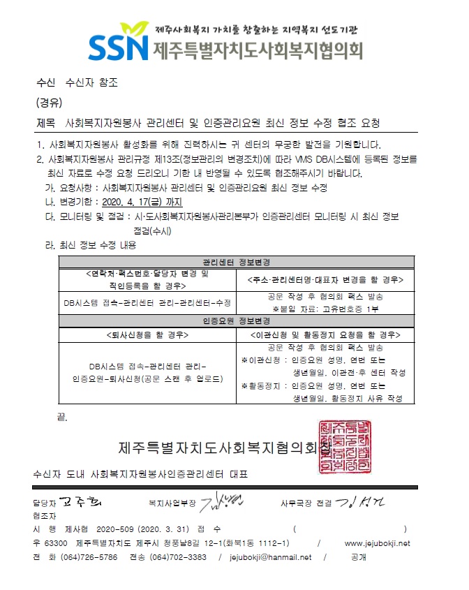 사회복지자원봉사 관리센터 및 인증관리요원 최신 정보 수정 협조 요청