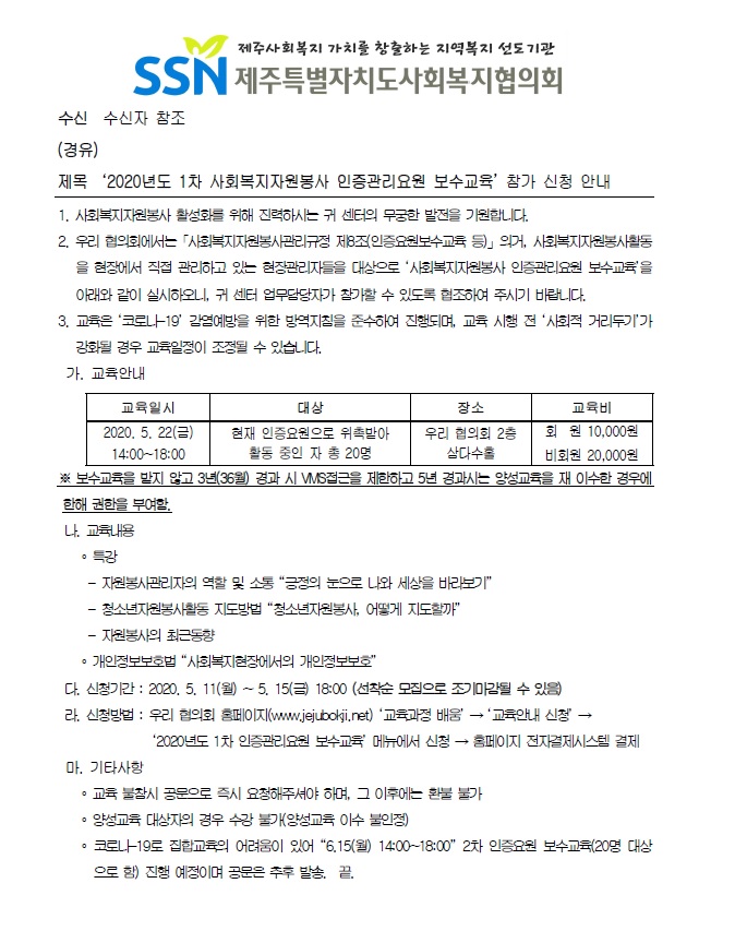 2020년도 1차 사회복지자원봉사 인증관리요원 보수교육 참가 신청 안내