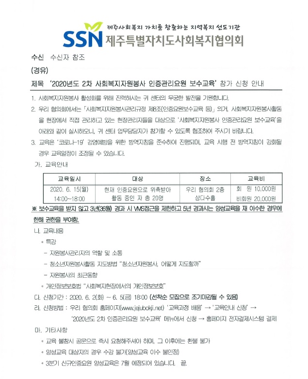 2020년도 2차 사회복지자원봉사 인증관리요원 보수교육 참가 신청 안내