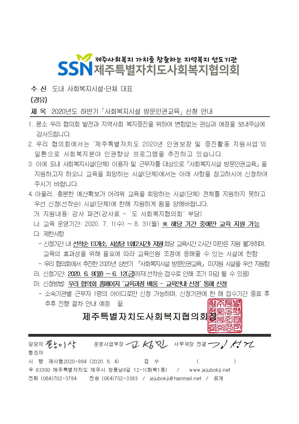 2020년도 하반기 「사회복지시설 방문인권교육」 신청 안내