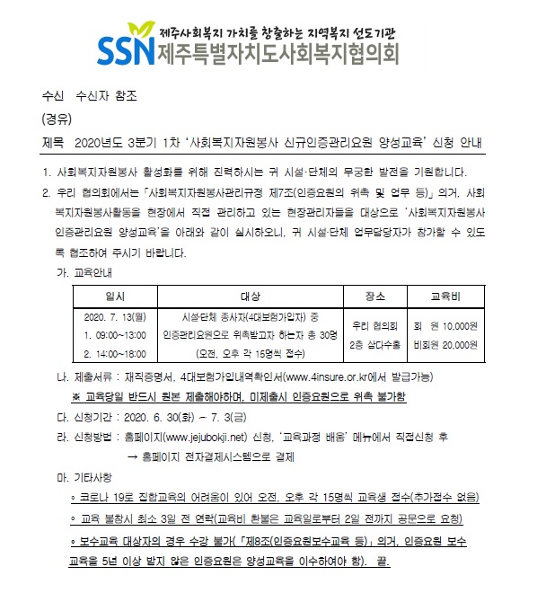 2020년도 3분기 1차 '사회복지자원봉사 신규인증관리요원 양성교육' 신청 안내