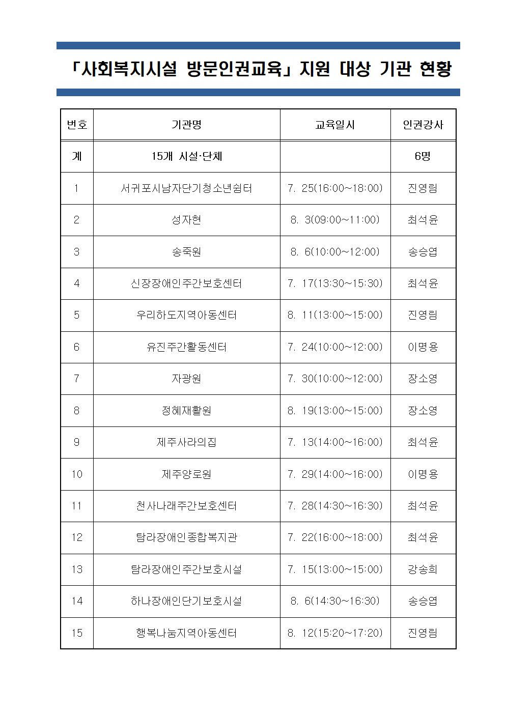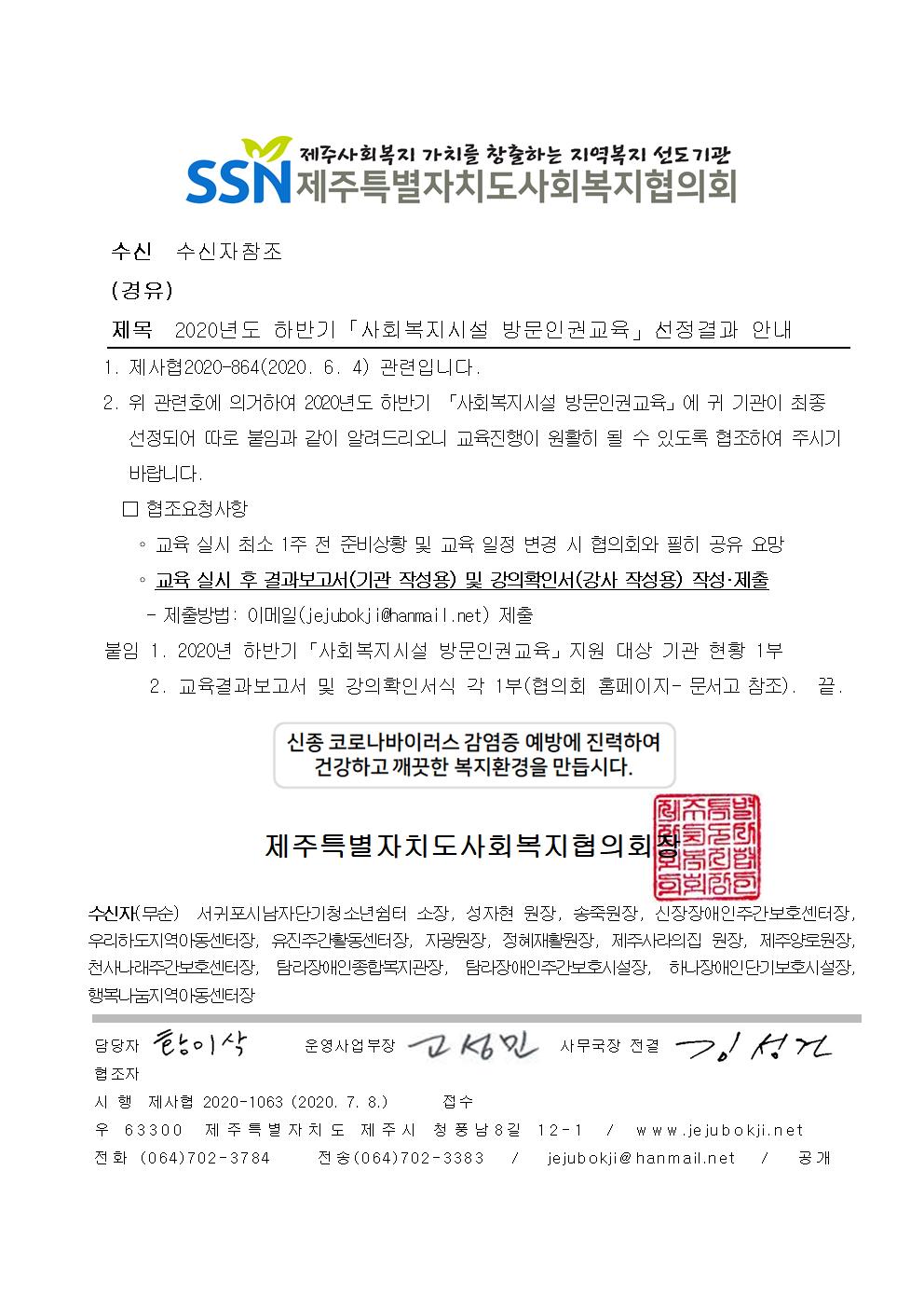 2020년도 하반기「사회복지시설 방문인권교육」선정결과 안내