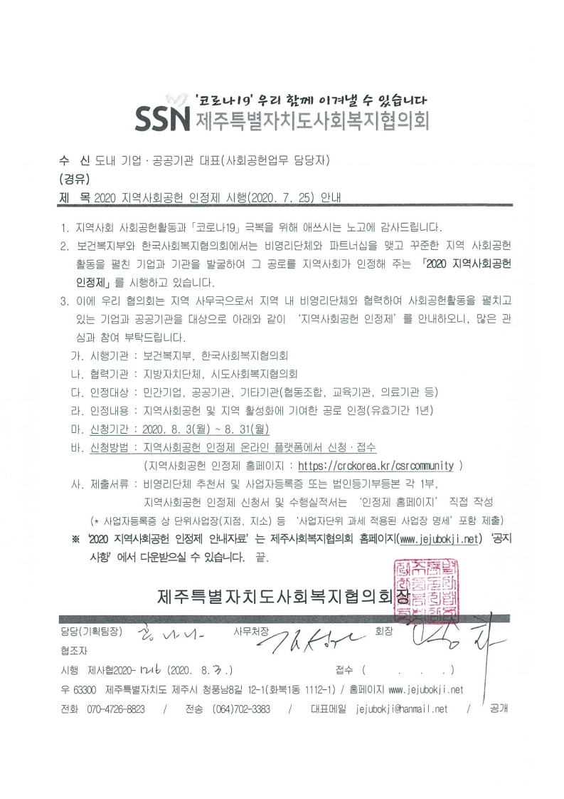 2020 지역사회공헌 인정제 시행(2020. 7. 25) 안내