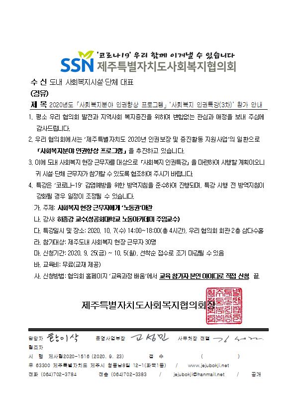 2020년도「사회복지분야 인권향상 프로그램」‘사회복지 인권특강(3차)’ 참가 안내