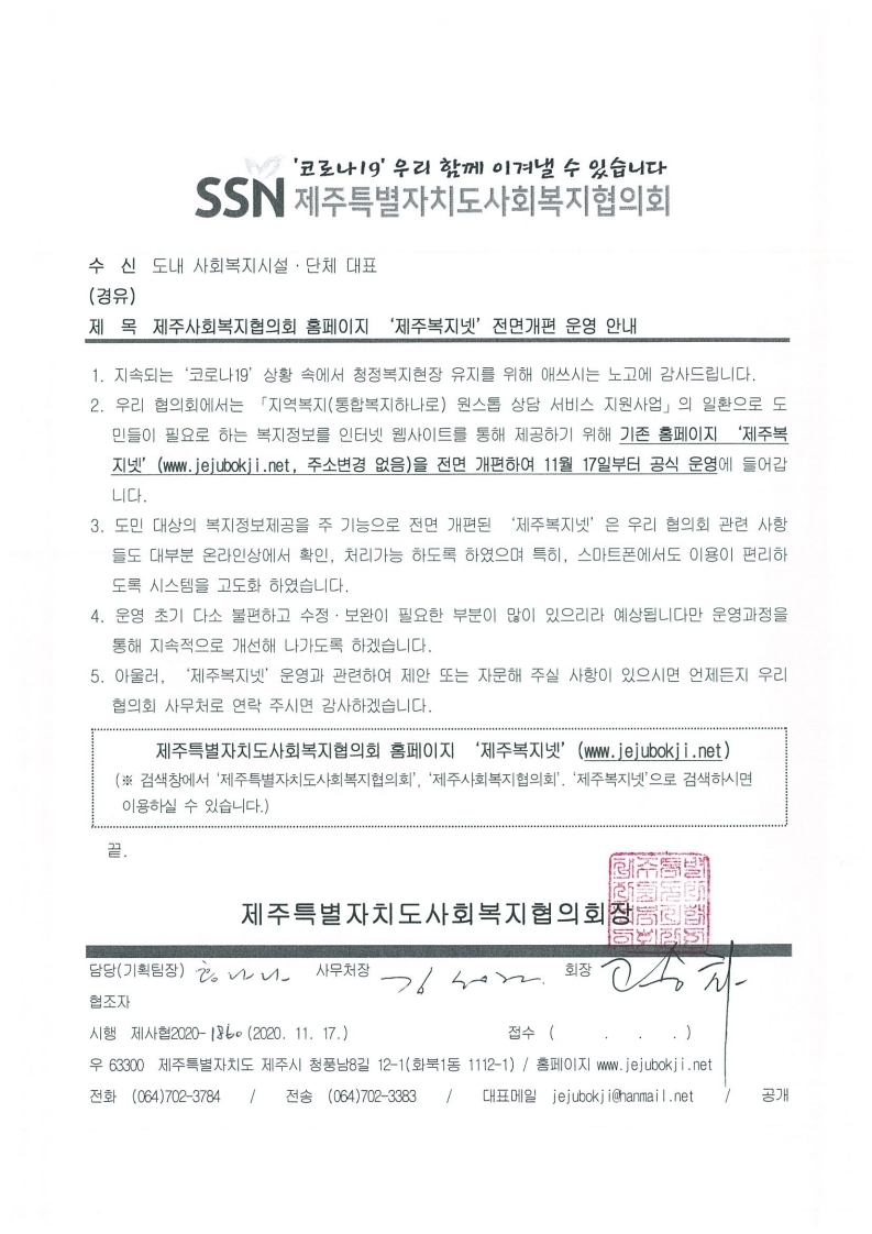 제주사회복지협의회 홈페이지 '제주복지넷' 전면개편 운영 안내