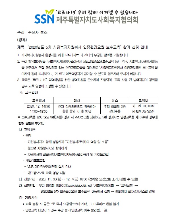 2020년 5차 사회복지자원봉사 인증관리요원 보수교육 참가 신청 안내
