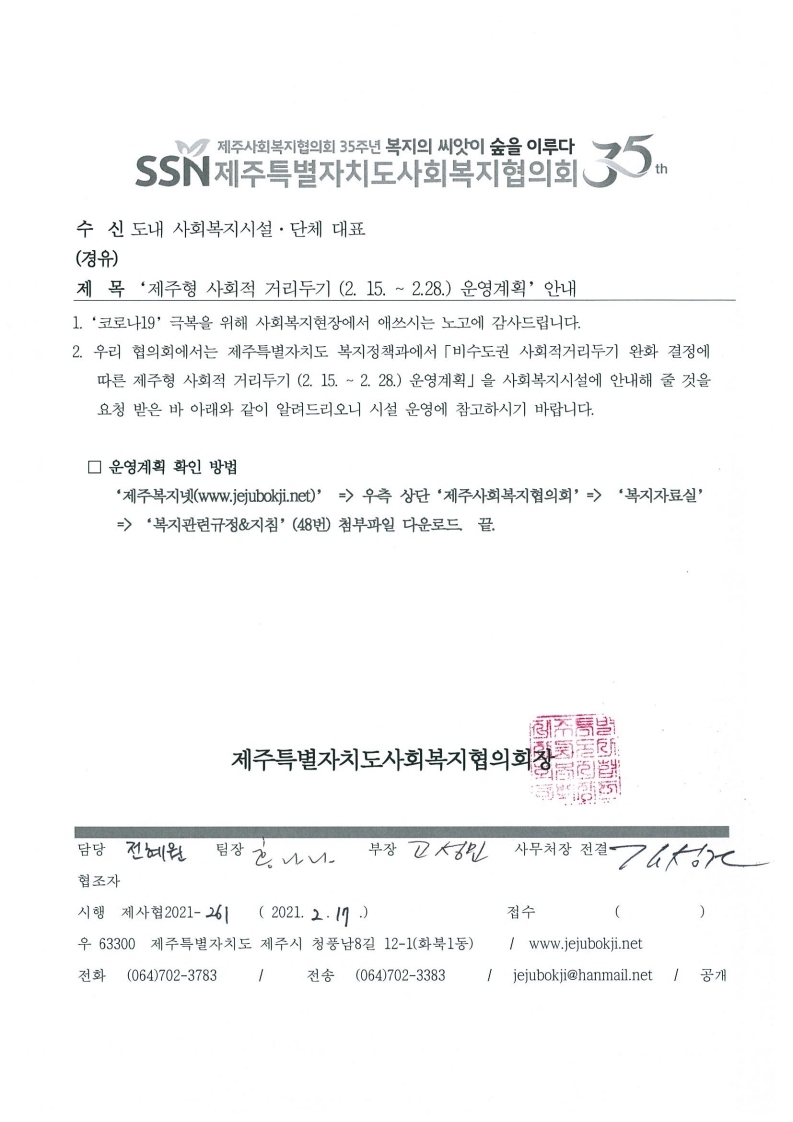 '제주형 사회적 거리두기(2.15~2.28) 운영계획' 안내