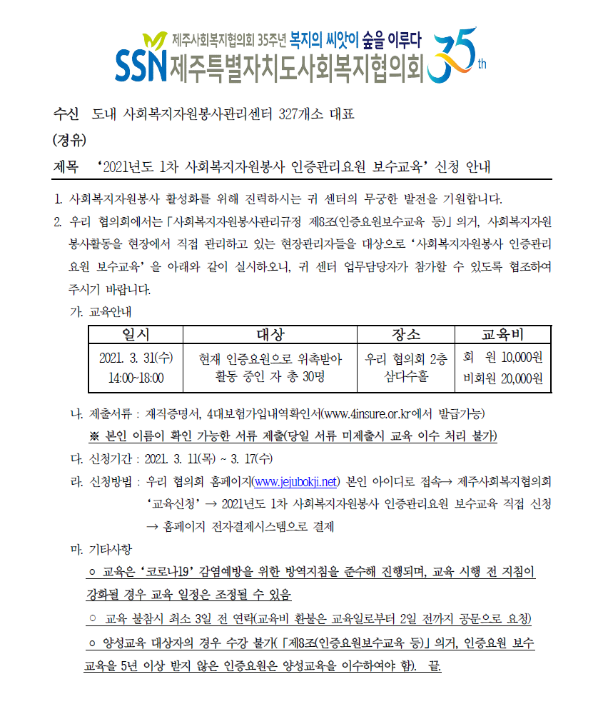 2021년도 1차 사회복지자원봉사 인증관리요원 보수교육 신청 안내