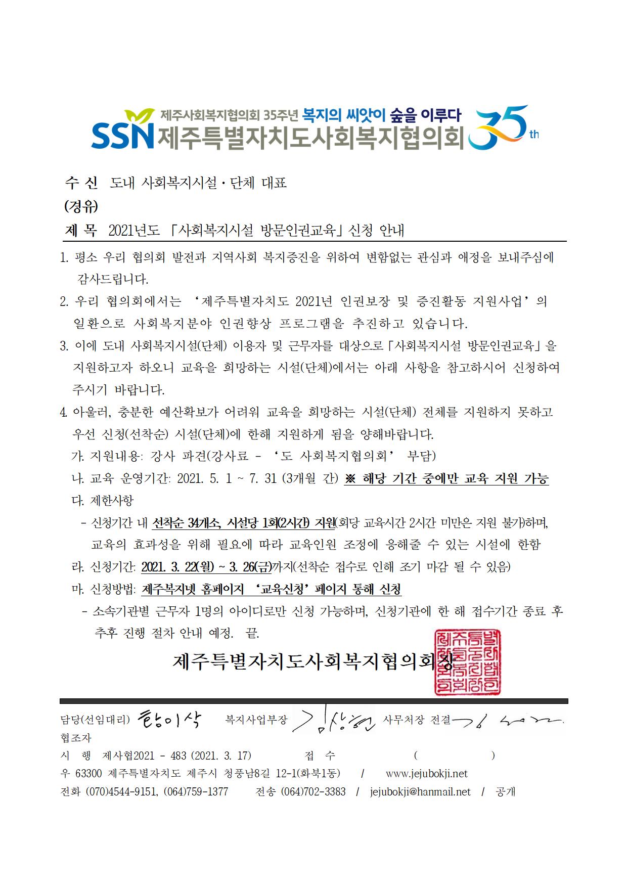 2021년도 「사회복지시설 방문인권교육」신청 안내 (마감)