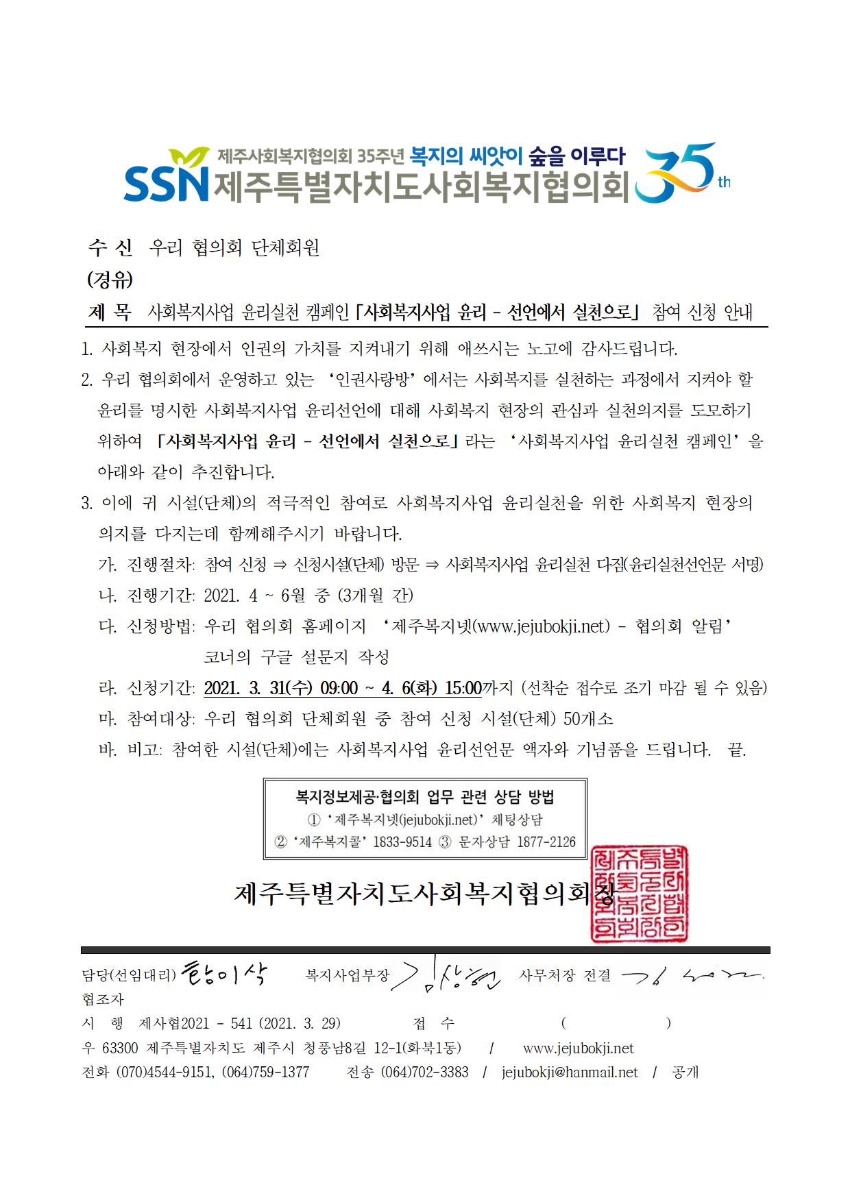 사회복지사업 윤리실천 캠페인「사회복지사업 윤리 - 선언에서 실천으로」 참여 신청 안내