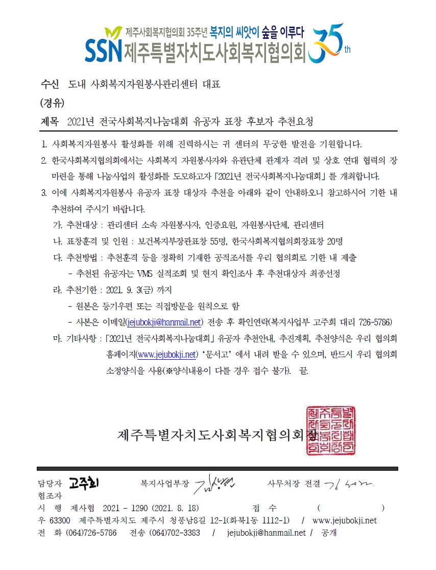 2021년 전국사회복지나눔대회 유공자 표창 후보자 추천 요청