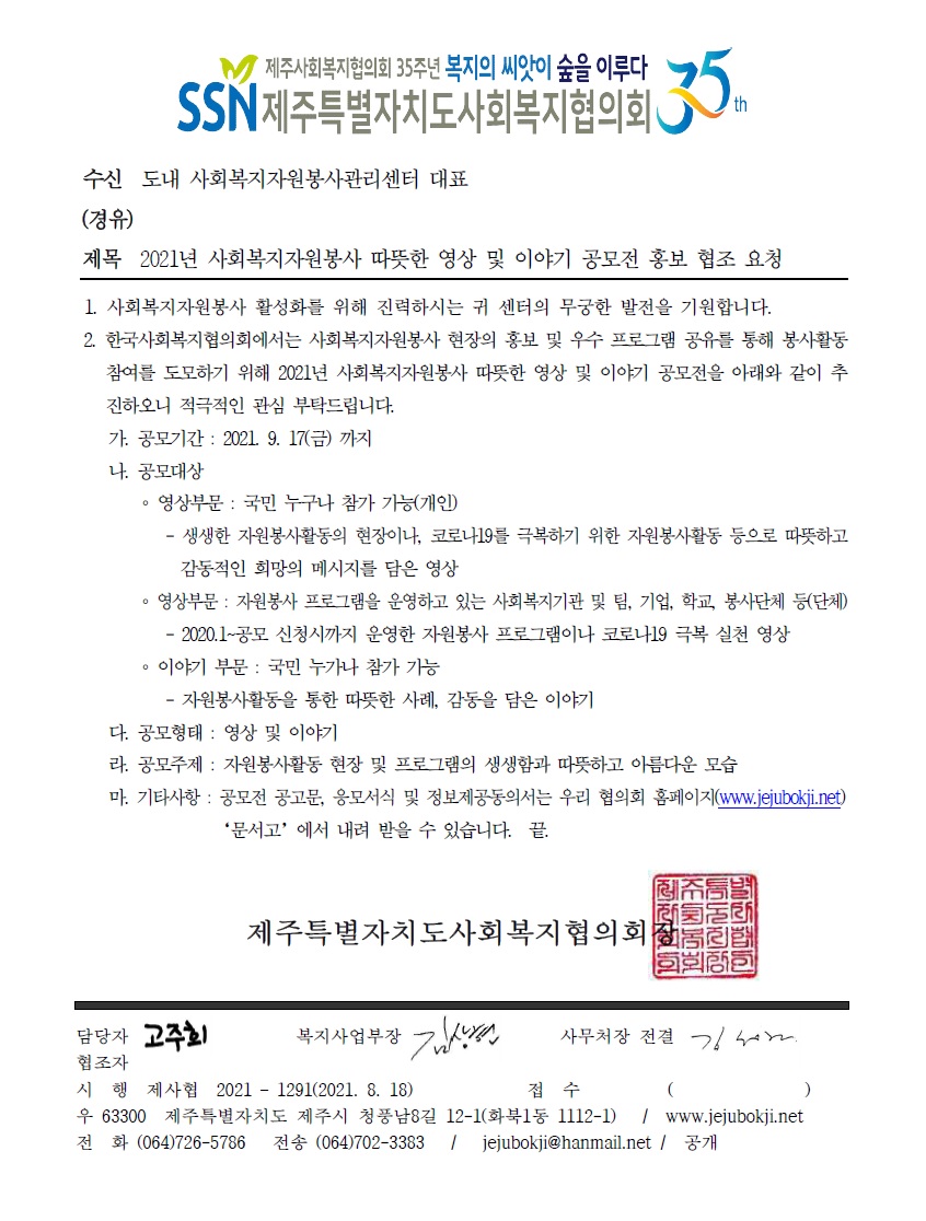 2021년 사회복지자원봉사 따뜻한 영상 및 이야기 공모전 홍보 협조 요청