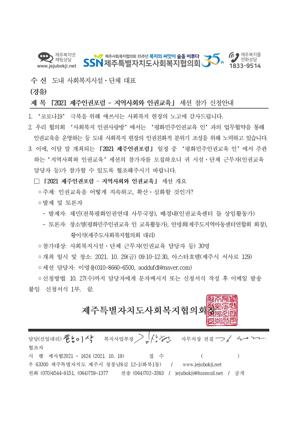 「2021 제주인권포럼 - 지역사회와 인권교육」 세션 참가 신청안내