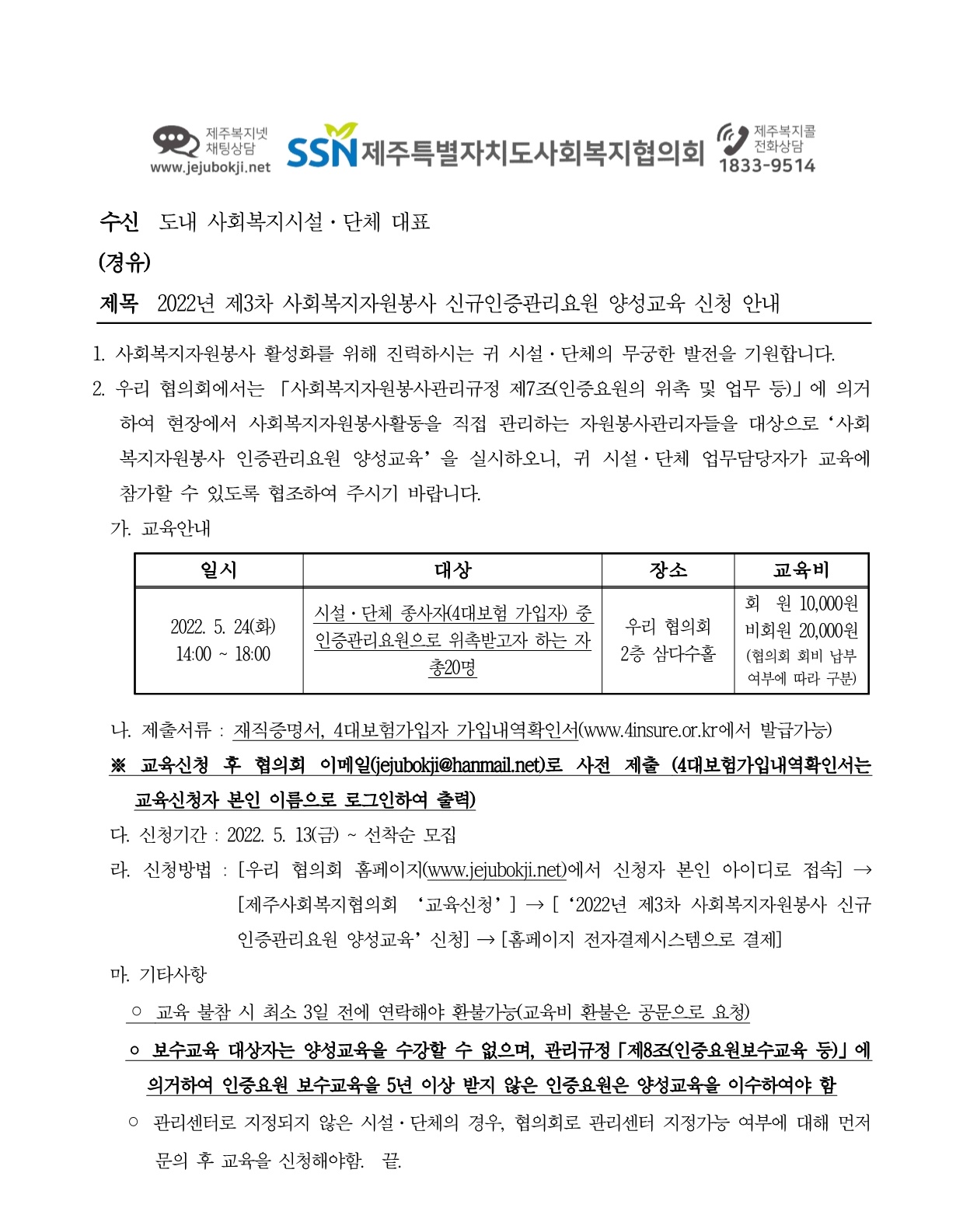 2022년 제3차 사회복지자원봉사 신규인증관리요원 양성교육 신청 안내