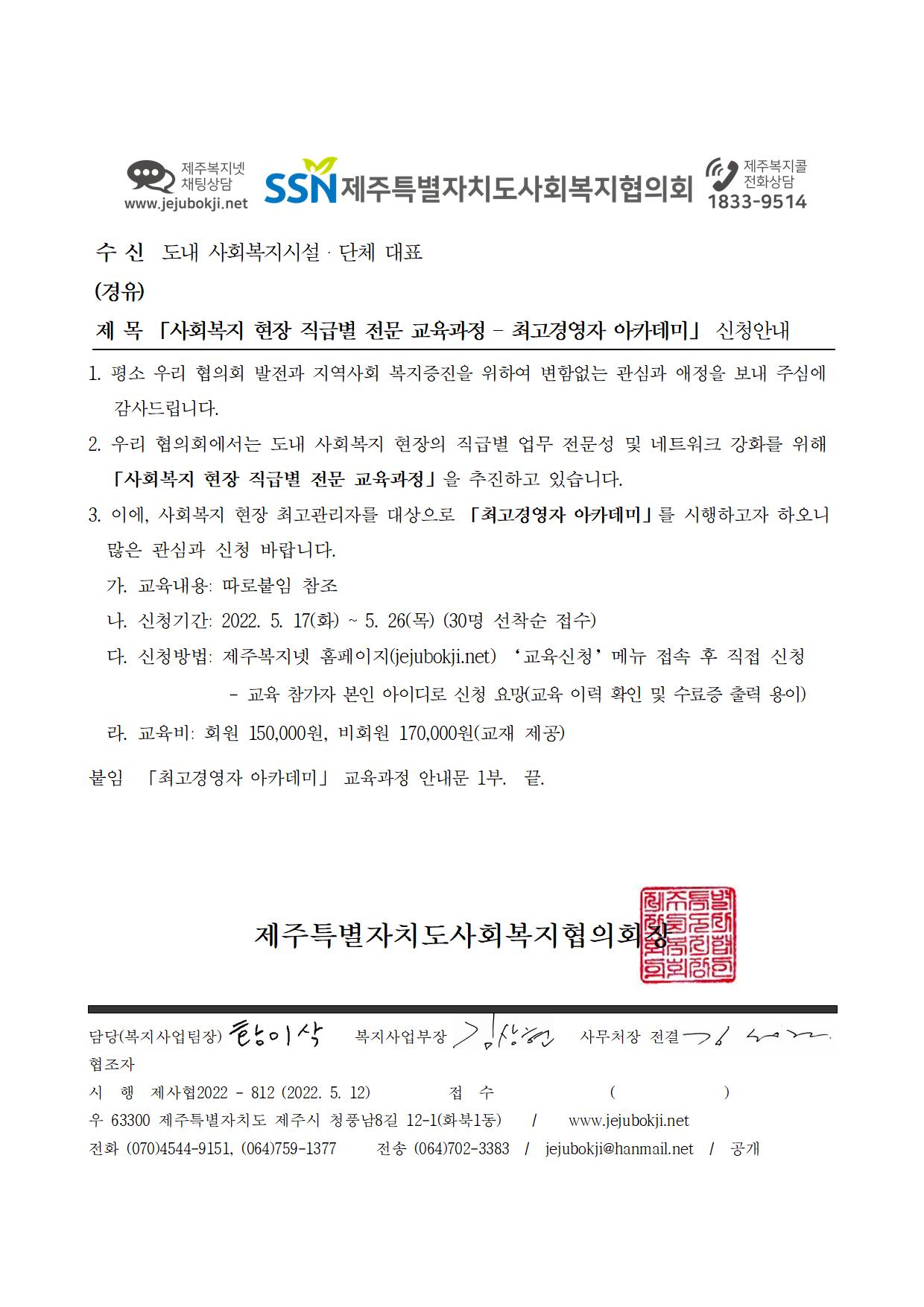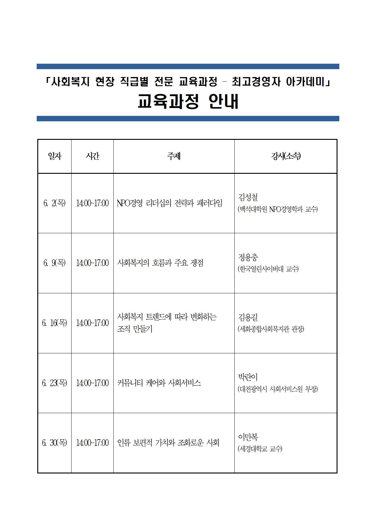 「사회복지 현장 직급별 전문 교육과정 – 최고경영자 아카데미」 신청안내