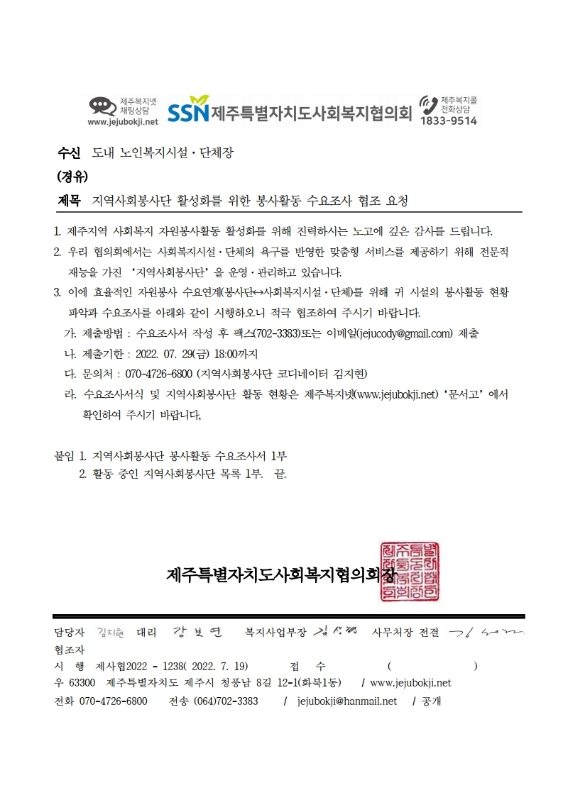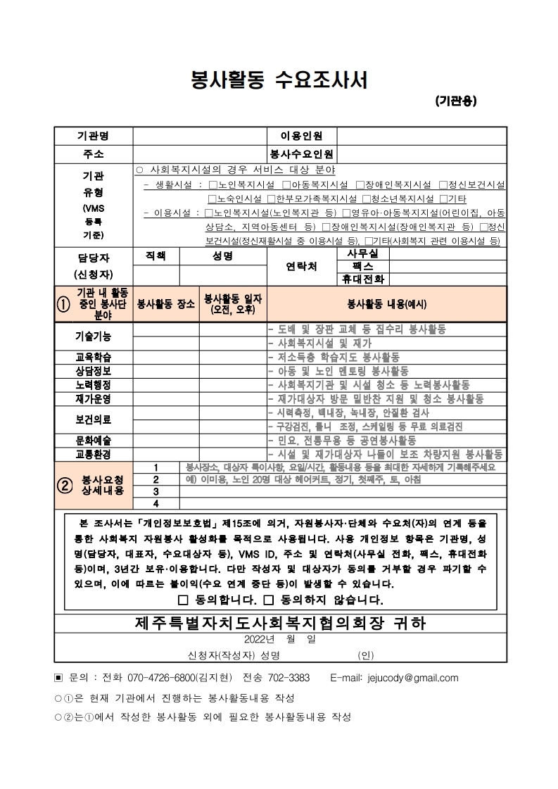 지역사회봉사단 활성화를 위한 봉사활동 수요조사 협조요청