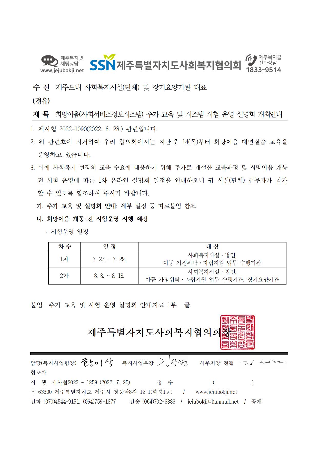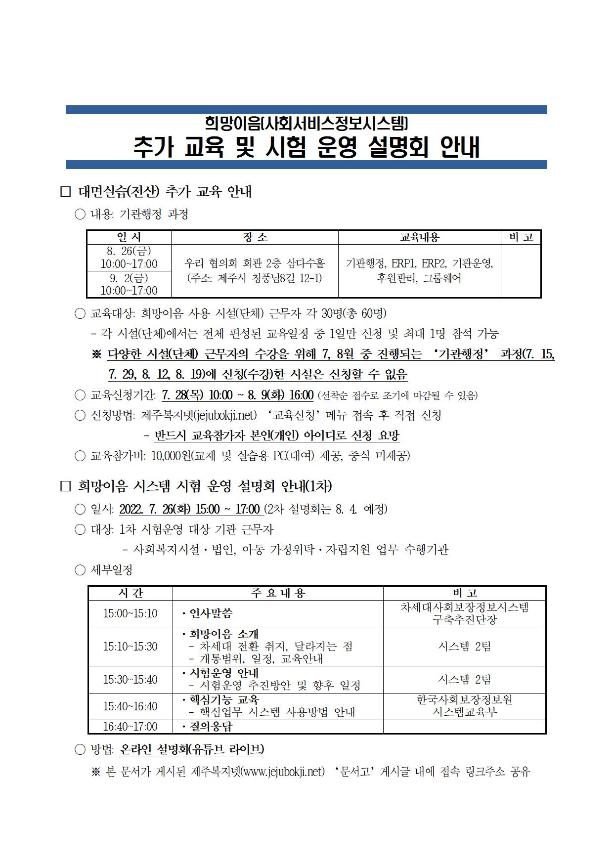 희망이음(사회서비스정보시스템) 추가 교육 및 시스템 시험 운영 설명회 개최안내