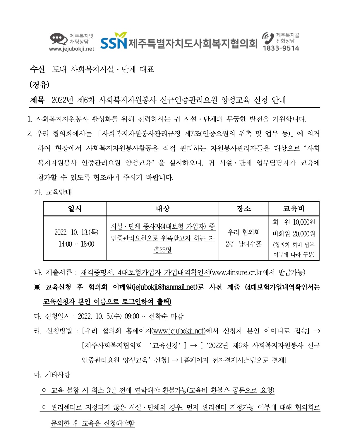 6차 사회복지자원봉사 신규인증관리요원 양성교육 신청 안내