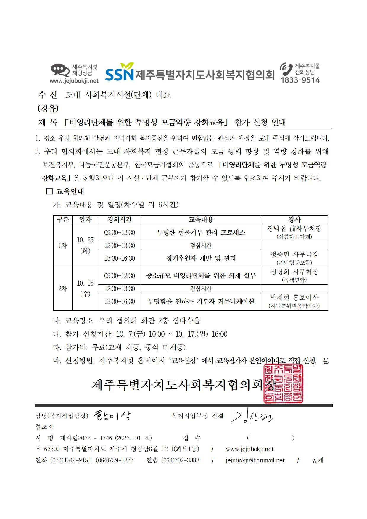 「비영리단체를 위한 투명성 모금역량 강화교육」 참가 신청 안내