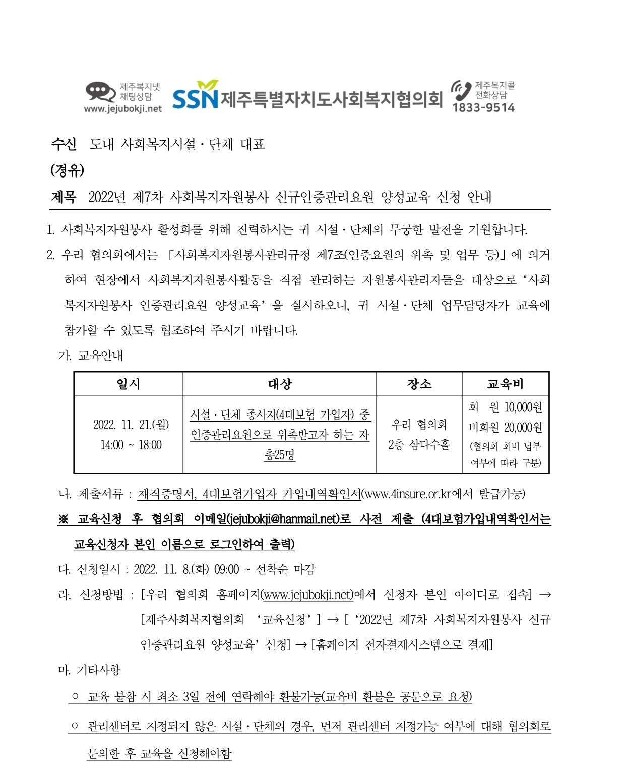 7차 사회복지자원봉사 신규인증관리요원 양성교육 신청 안내