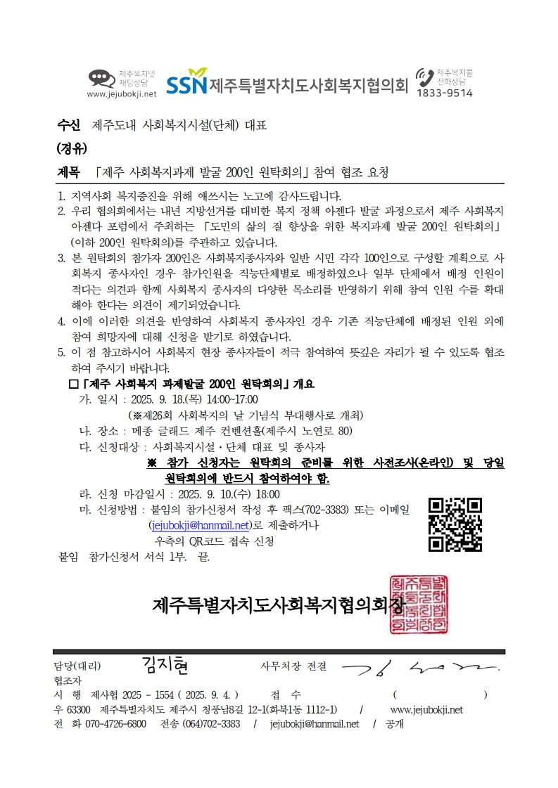 「제주 사회복지과제 발굴 200인 원탁회의」참여 협조 요청