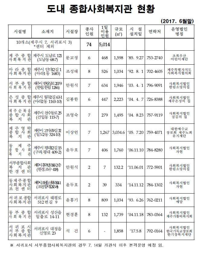 도내 종합사회복지관 현황(2017년 6월 기준) 입니다.