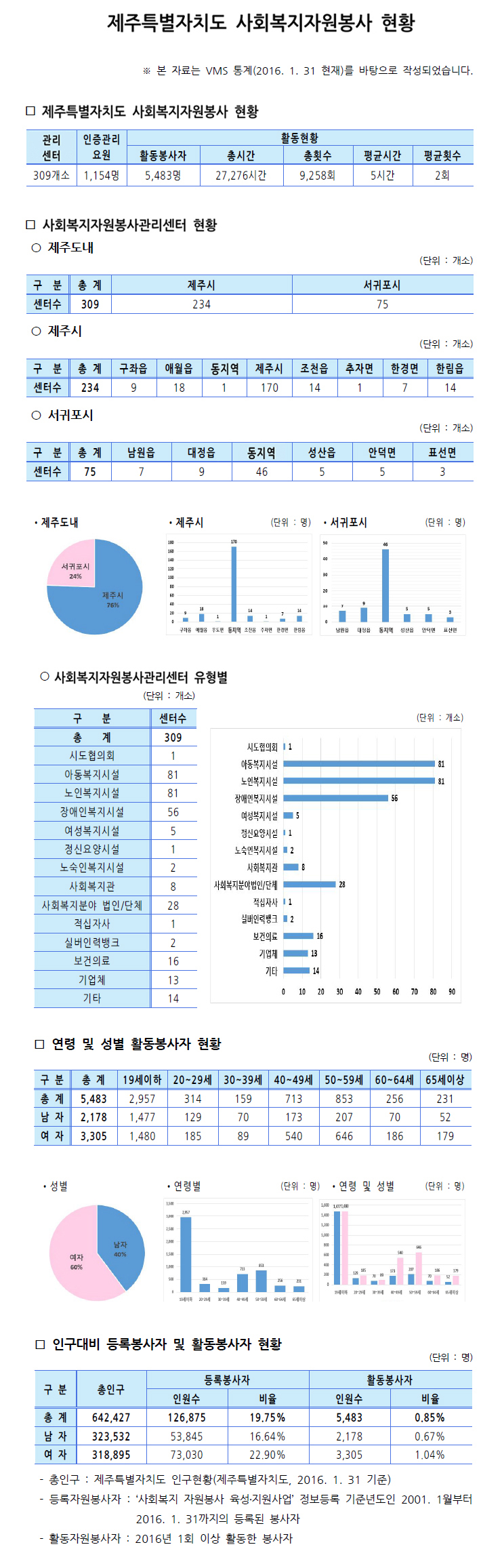 제주특별자치도 자원봉사현황(2016. 1. 31 기준)