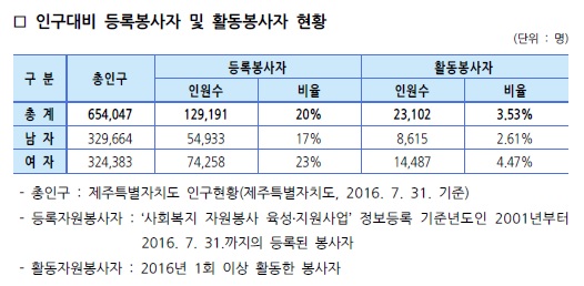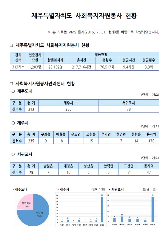 제주특별자치도 자원봉사현황(2016. 7. 31. 기준)