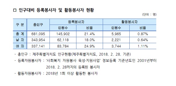 제주특별자치도 자원봉사현황(2018. 2. 28. 기준)